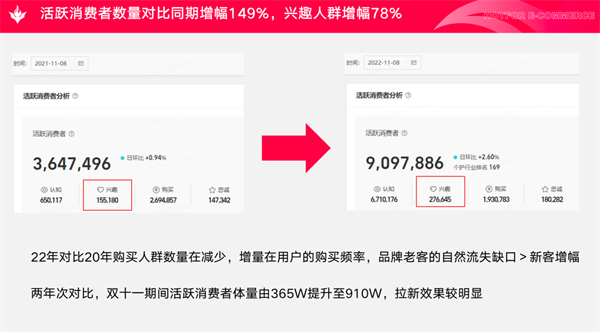 其中,發(fā)現(xiàn)人群增長270萬、種草人群增長9萬、互動人群增長3.5萬、行動人群增長2.7萬、首購人群增長3.3萬、復(fù)購人群增長0.6萬、至愛人群增長0.2萬、站內(nèi)廣告投產(chǎn)1:7。
